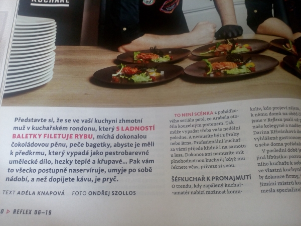 Média o nás stále jeví zájem. Píší o nás v prestižním týdeníku REFLEX, což nás velmi těší. Jednalo se natočení reportáže vaření s našimi špičkovými kuchaři do domu na oslavě jubilea přímo u zákazníka v rodinném domě.