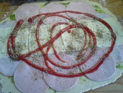 Mouku nasypeme na vál, na ní nastrouháme ztužený tuk, osolíme a zpracujeme. Na pomoučeném vále rozválíme na tenký plát. Potřeme česnekovým pestem a poklademe uzeninou. Přidáme na nudličky nakrájenou papriku, kečup a okořeníme.